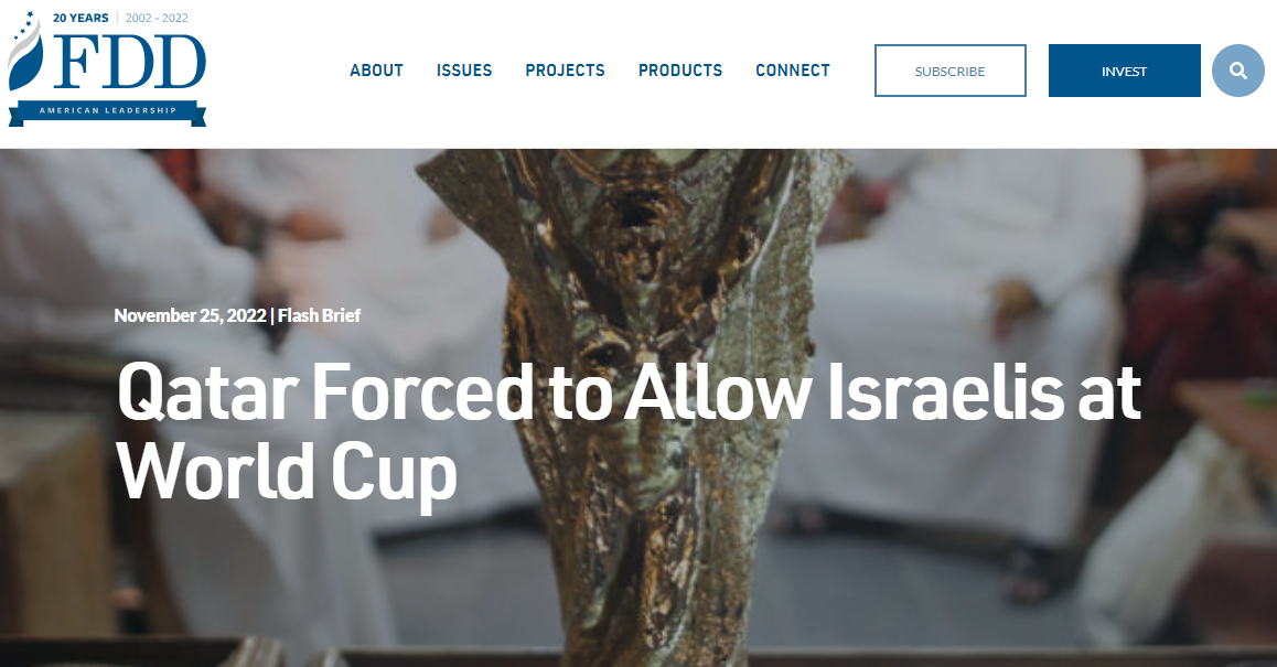 در این راستا اندیشکده آمریکایی – صهیونیستی «بنیاد دفاع از دموکراسی ها» در گزارشی آورده است: تعداد زیادی اسرائیلی به قطر سفر کرده اند زیرا این کشور خلیج فارس میزبان جام جهانی است. با وجود هجوم بازدیدکنندگان، نشانه های پررنگی وجود دارد که این تورنمنت منادی یک پیشرفت دیپلماتیک بین دوحه و تل آویو نخواهد بود…. اما عملگرایی قطری در قبال اسرائیل نباید با تساهل یا تعامل دیپلماتیک اشتباه گرفته شود. وسواس دوحه برای میزبانی بزرگترین تورنمنت فوتبال، این کشور خلیج فارس را که روابط دیپلماتیک با دولت یهود ندارد، مجبور کرد به بازدیدکنندگان اسرائیلی این اجازه را بدهد.